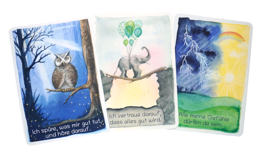 Wir haben viele Jahre lang Affirmationskarten mit anderen Bildern genutzt und unsere Kinder haben gefragt, was denn das Bild mit dem Spruch zu tun hat. Wir wollten das anders lösen und statt „irgendwelchen Bildern“ haben wir gemeinsam mit der Künstlerin nach Motiven gesucht, die über die abgebildete Handlung und die Stimmung des Bildes bereits das Gefühl der Affirmation rüberbringen.